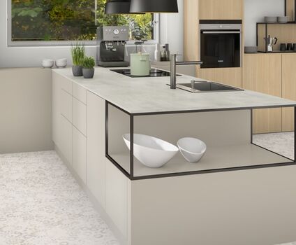 Серая галька относится к модным оттенкам цвета тауп, которые за счёт своего особого серого цвета позволяют создавать большое количество разнообразных комбинаций. По сравнению с холодными серыми тонами этот декор смотрится более тёплым, а с бежевыми и коричневыми оттенками – скорее серым. За счёт своего промежуточного характера он сочетается со многими репродукциями древесины и материалов.
