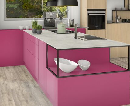 Оригинальным и ярким акцентом выступает Фуксия розовая в сочетании с белыми или сероватыми древесными декорами или репродукциями бетона. Этот декор часто находит применение в детских комнатах как цветовое решение для девочек. Но и в оформлении модных помещений, таких как магазины или выставочные залы, этот цвет может удачно подходить к бренду и товарам.