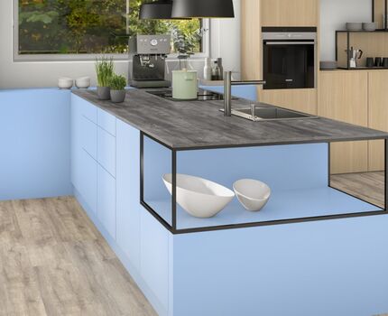 Светлый Голубой горизонт относится к пастельным декорам, которые за счёт своего сдержанного характера создают гармоничные сочетания вместе с естественными современными древесными декорами с некоторой долей серого. В скандинавском дизайне этот цвет часто сочетают с белыми или светлыми древесными декорами