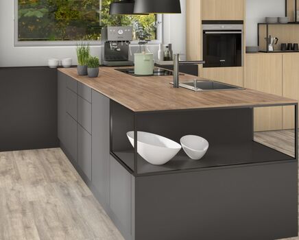 Нежный чёрный – очень тёмная, почти чёрная вариация серого с долей тёплого коричневого цвета из категории модных оттенков «Nearly Black» (почти чёрный). В мебели он используется для создания чрезвычайно элегантного контраста в сочетании с тёмно-коричневыми древесными декорами, как например, Орехом, и поэтому часто применяется в мебели для гостиной. Декор представляет альтернативу для резких контрастных решений с чёрным цветом.