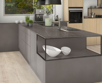 Декор Кубанит брашированный напоминает металл тёплого серого оттенка, крацованный стальной щёткой в круговом направлении. Он образует интересные сочетания с древесными декорами серо-коричневых оттенков.