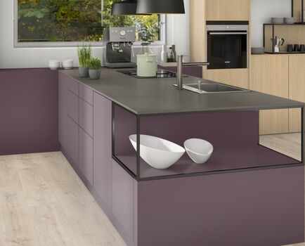 Декор Баклажан фиолетовый смотрится элегантно и женственно в сочетании с репродукциями материалов серого или тёмных цветов. Со светлыми древесными декорами, например, Клёном, он смотрится модно и оригинально.