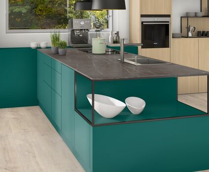 Зелёные джунгли – это самый тёмный из так называемых «водных» цветов, для которых характерна заметная доля синего. Он удачно комбинируется с оттенками серого и серыми репродукциями материалов и смотрятся оригинально и актуально. В сочетании с декором Белый его насыщенность усиливается.