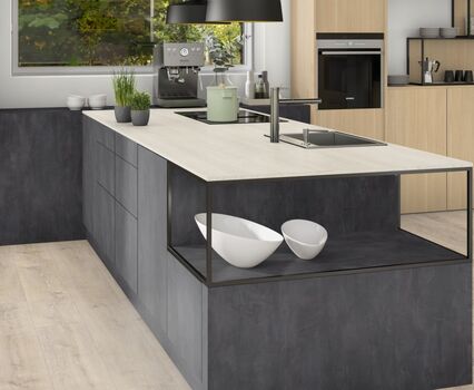 Декоры серии Сланец Металл объединяют в себе текстуру сланца с сиянием металла. Цвет серебристо-серый имеет скорее холодный оттенок, который хорошо сочетается с древесными репродукциями светлых натуральных оттенков и с холодными оттенками серого цвета.