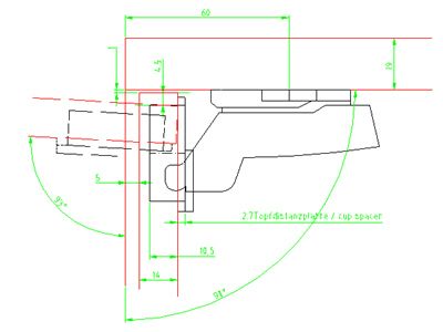 - Для уменьшения глубины сверления под чашку петли в случае тонких дверей или дверей из материала низкой плотности