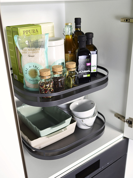 Торн Моушн - это вращающийся механизм, который помогает эффективно использовать сложнодоступные пространства на кухне — над встроенной бытовой техникой и в верхних отделениях высоких шкафов. Главное преимущество системы — независимое вращение каждой полки вокруг своей оси и регулировка по высоте. Так вы сможете грамотно задействовать каждый сантиметр кухни и быстро находить нужные вещи в шкафу.