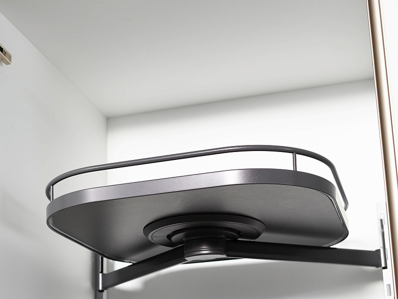 Торн Моушн - это вращающийся механизм, который помогает эффективно использовать сложнодоступные пространства на кухне — над встроенной бытовой техникой и в верхних отделениях высоких шкафов. Главное преимущество системы — независимое вращение каждой полки вокруг своей оси и регулировка по высоте. Так вы сможете грамотно задействовать каждый сантиметр кухни и быстро находить нужные вещи в шкафу.