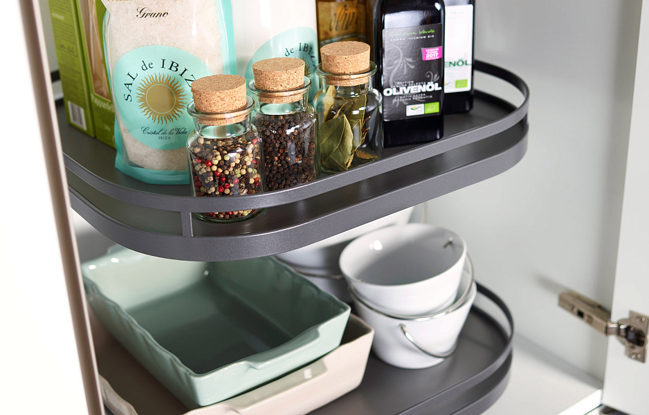 Торн Моушн - это вращающийся механизм, который помогает эффективно использовать сложнодоступные пространства на кухне — над встроенной бытовой техникой и в верхних отделениях высоких шкафов. Главное преимущество системы — независимое вращение каждой полки вокруг своей оси и регулировка по высоте. Так вы сможете грамотно задействовать каждый сантиметр кухни и быстро находить нужные вещи в шкафу.