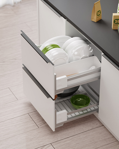Специально для нижних шкафов мы создали удобный органайзер для хранения посуды и сервировки – Дайнинг Агент. Удобные комплекты для организации хранения в выдвижных механизмах позволяют выбрать оптимальный вариант под ваши задачи: большие тарелки, много чашек или универсальный набор для хранения разного типа посуды. Внутреннее наполнение легко достать и можно использовать в качестве сервировочных подносов.