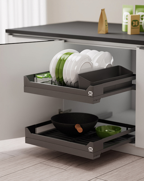 Специально для нижних шкафов мы создали удобный органайзер для хранения посуды и сервировки – Дайнинг Агент. Удобные комплекты для организации хранения в выдвижных механизмах позволяют выбрать оптимальный вариант под ваши задачи: большие тарелки, много чашек или универсальный набор для хранения разного типа посуды. Внутреннее наполнение легко достать и можно использовать в качестве сервировочных подносов.