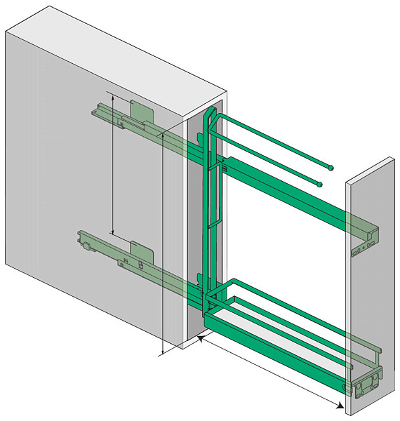 - Комплектация: рама с фасадным креплением 2 полки, направляющие полного выдвижения Grass XP, доводчик плавного закрывания