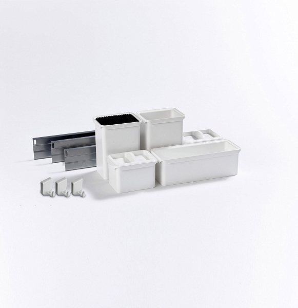 Система хранения Юбокс состоит из разнообразных контейнеров, которые можно приспособить для хранения, ножей, специй, бутылок масла, специй, соусов. У Вас всегда есть возможность установить контейнеры в удобном для Вас порядке и на комфортной высоте. Все контейнеры крепятся на рейке, Вы можете расположить их согласно вашим потребностям.