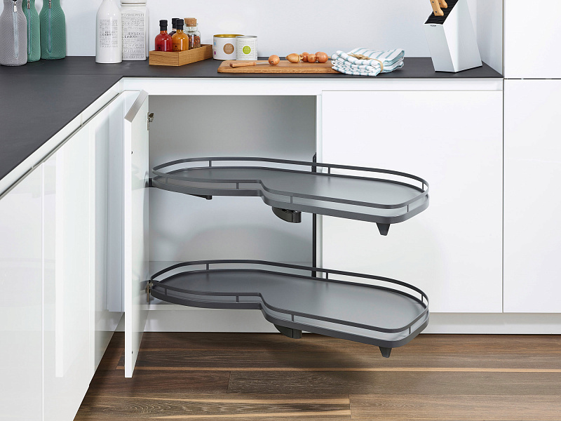 Леманс - идеальный поворотно-выдвижной механизм для прямых угловых тумб! Удобство и лёгкость в работе поражает - каждая полка полностью выезжает из тумбы, обеспечивая полный и беспрепятственный доступ к содержимому.