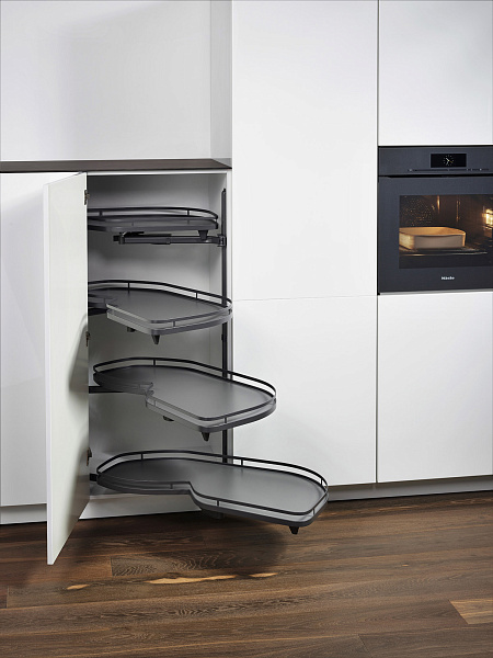 Леманс - идеальный поворотно-выдвижной механизм для прямых угловых тумб! Удобство и лёгкость в работе поражает - каждая полка полностью выезжает из тумбы, обеспечивая полный и беспрепятственный доступ к содержимому.