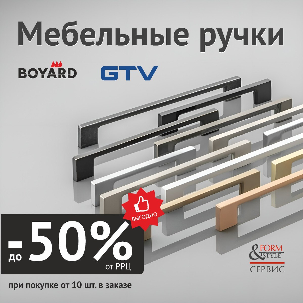 Друзья! Специальное предложение на лицевую фурнитуру! Покупайте мебельные ручки GTV и Boyard с выгодой до -50% только до конца октября при покупке от 10 штук в одном заказе.